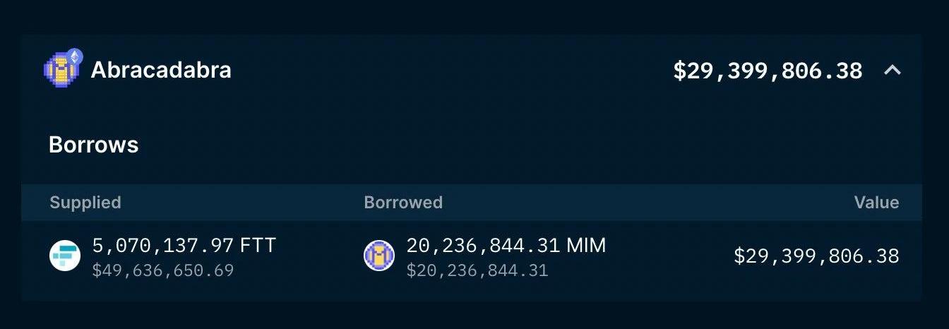 Alameda還用價值5000多萬美元的FTT借了2000多萬MIM代幣。這可能只是DeFi借貸市場上無數個類似頭寸中的一個,由于其超額抵押的性質,這些頭寸的損失可能會很小。