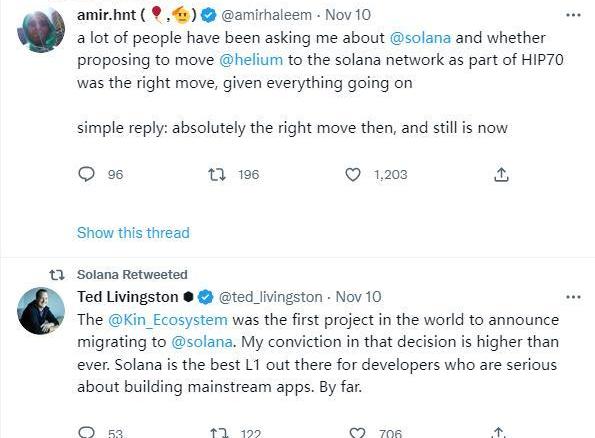 數據來源:CoinmarketCapSBF長期以來一直與Solana有千絲萬縷的聯系,旗下AlamedaResearch是Solana早期投資者之一,并一手促成Serum、Oxygen等Solana早期生態項目的誕生,在去年年初Solana機構投資者代幣解鎖時,SBF還曾以3美元的價格通過OTC購買投資者的全部SOL資產,此后也投資了大量的Solana生態項目Solana在FTX事件上的公關略顯尷尬。9日,SolanaLabs聯創toly發推表示:“SolanaLabs在FTX上沒有任何資產。”并特意強調Solana是“美國”公司。隨后,SolanaLabs、Solana負責人和創始人們開始通過喊口號“號召”社區共渡難關,并且向其投資人、生態項目等“親友團”求助,JumpCrypto總裁KanavKariya,KinEcosystem、Teleportxyz、MagicEden等項目紛紛開始為Solana站臺,表示長期看好Solana。