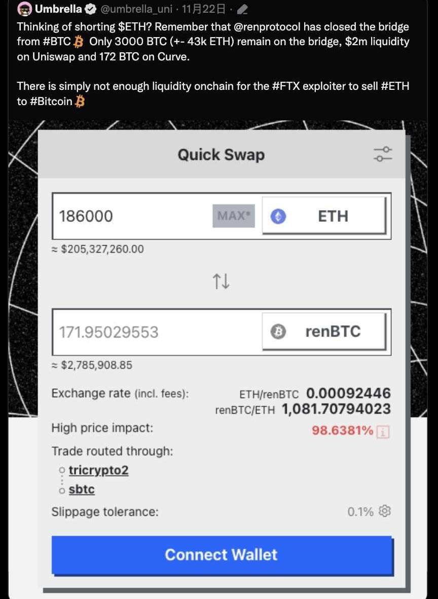 從REN的角度出發,我認為橋接流動性和FTX黑客是兩個主要的風險因素。我沒有使用過RenProtocol,也歡迎大家做以補充。許多人覺得「FTX黑客」可能會采取進一步行動,因此正在做空ETH。但由于流動性限制,「黑客」手里的ETH可能也賣不出去。隨著「黑客」繼續尋找將資產兌換為BTC的方法,這可能導致wrapped資產出現其他問題。