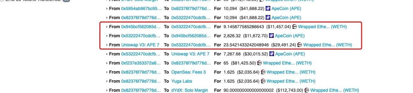 顯然,這條友情提醒并沒有被廣泛傳播,導致在APE質押功能上線幾小時內,就觸發了該套利機制。據派盾監測,有套利者從dYdX以閃電貸的方式借入82ETH購買BAYC#6762,從而獲得其質押的6400枚APE。套利者將APE賣出獲得20ETH,后以68ETH的價格賣出BAYC#6762,凈賺約6ETH。很快,該套利模式就被成功復制。一套利者同樣從dYdX平臺以閃電貸的方式借出90枚ETH,并購入BAYC#1633,同時獲得了該NFT下質押的10,000枚APE;套利者后又將所得APE分批兌換為約9.1枚ETH和23.54枚ETH,共計32.68枚ETH,然后將BAYC#1633以65ETH價格出售,凈賺約7ETH。