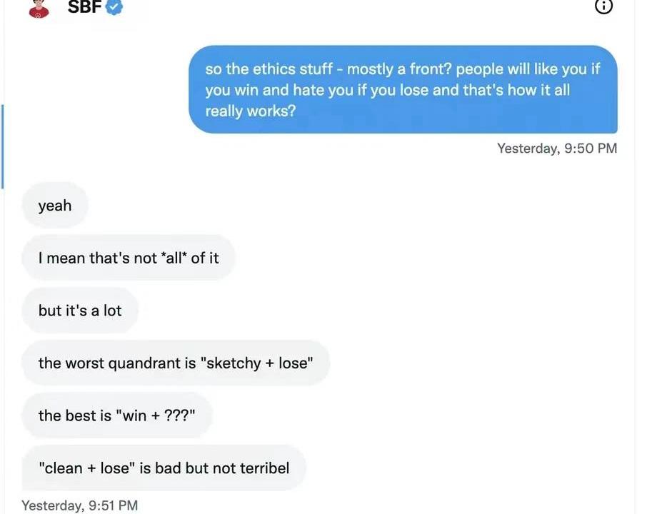 有一個很多人在猜測的問題——SBF是否認為“為了更大的利益”而做不道德的事情是可以接受的。這是SBF過去所認為的自利主義者可能會持有的立場。這個問題碰巧是我在今年夏天的采訪中問過他的,在我們進行推特對話的前一天晚上,我剛剛重新聽了一遍當時的采訪。當時我認為SBF對于“越界”要面對道德難題是——經營加密貨幣交易所是否一開始就是正確的選擇,以及他聲稱自己想做的好事是否可以讓它成為可能。在之前的采訪中,我對SBF說:“很多人會認為開一家加密貨幣公司賺數十億美元,就像我開一家煙草公司賺數十億美元一樣非常不道德。假設,有一條線,即使有充分的理由,你也不能越界。我很好奇你是否認為有底線存在?如果存在,你的底線又在哪里?”SBF回答:“確實是有底線的,答案不可能是沒有底線。否則,你最終可能造成的傷害遠遠大于好處。但底線沒那么容易劃清。因為如果你的核心業務對世界有害,就會有很多復雜但嚴重的二級傷害。”在我們的推特對話中,我又問起了他對道德底線對看法。夏天的采訪中SBF認為不能為了所謂正確的事而做出不道德的行為。而本次這場推特對話中SBF對當初那些正確的道德發言全盤否定,他承認他當時說的不是真心話。