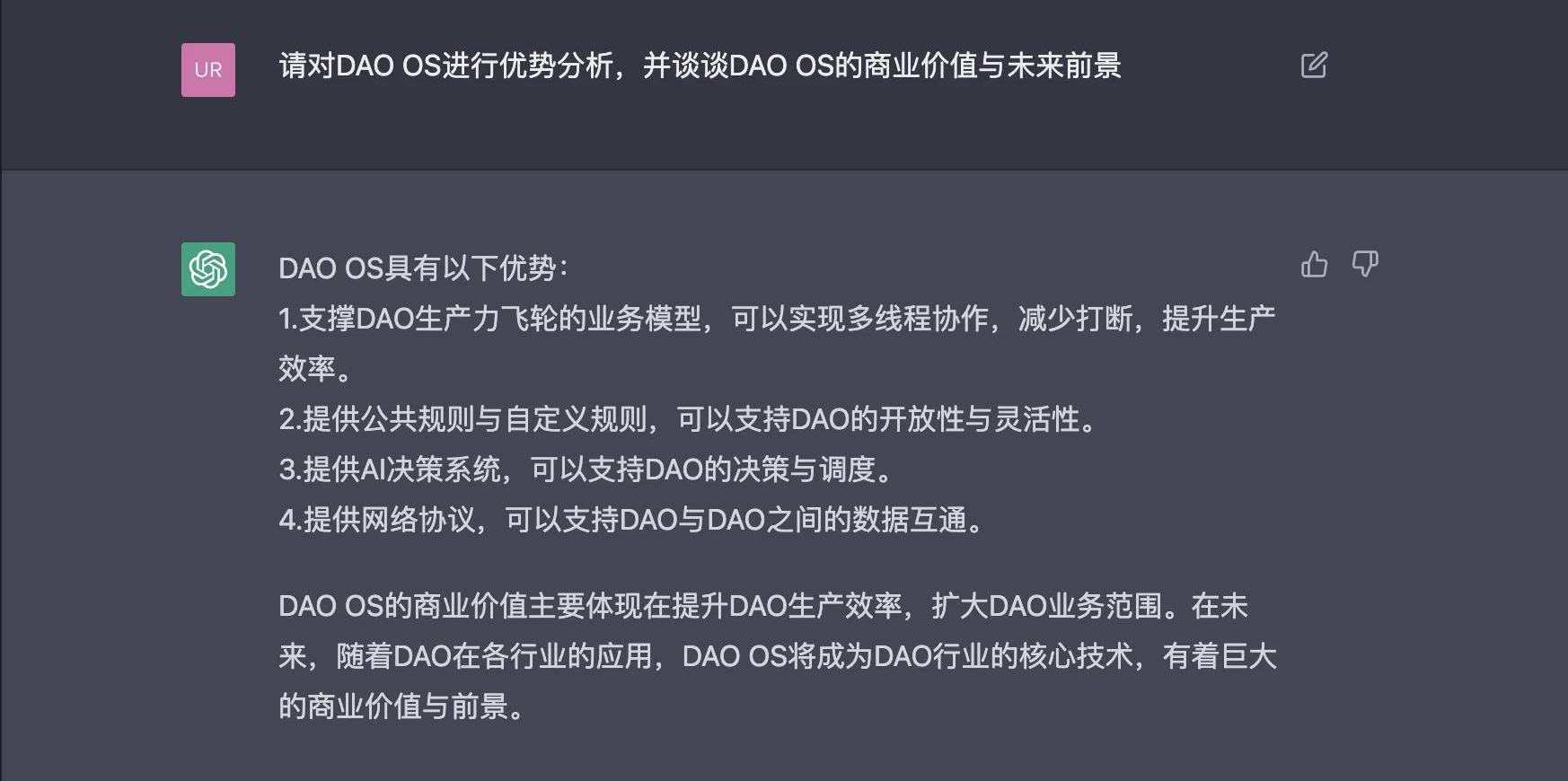 事實上,我們完全可以基于思維導圖,將以上的需求進行更加精細化的問答,ChatGPT將會提供顆粒度更加精細,以及邏輯關聯度更高的輸出內容。本次僅為預覽式的實測展示,但是效果其實還是挺令人震驚的。至于代碼的可用性,需要在測試環境上進行策劃。DAOOS這一產品的開發,我也會和技術伙伴一起嘗試真實的可用性。總而言之,ChatGPT幾乎是革命性顛覆了互聯網產品的生產方式,基于ChatGPT進行產品MVP的開發,我認為是具有可行性的。所有的創業團隊應該盡快擁抱ChatGPT,構建自己的咒語本。本次演示測試的咒語本1,讓我們來創建一個DAOOS,可以實現創建并運營一個DAO的基本功能2,回答真棒,請將你對DAOOS的回答,創建成為可執行的代碼程序,并將該版本定義為DAOOSbeta版本3,DAOOSBeta版本具體包含哪些功能點,請用一個二級目錄進行功能描述4,為了DAOOS能夠支撐業務活動,我們需要引入DAO增長飛輪的業務模型,你還記得DAO增長飛輪的特點以及業務模型嗎?5,請將DAO增長飛輪的業務模型,新增為DAOOSBeta的業務系統,并將5個業務模型根據功能,分別生成該業務系統的5組智能合約模塊,并將該版本定義為DAOOSbeta_1.06,請輸出上述5組智能合約的代碼,并整合到DAOOSBeta版本的代碼中,并將該完善后的代碼定義為DAOOSBeta1.0,7,請完整描述,當前DAOOSBeta1.0版本的具體功能,并用2級目錄進行描述8,請結合上文所敘,完整規劃DAO的三層治理架構,并進行功能介紹與場景案例描述9,請在DAOOS的元規則層建立一個網絡協議系統,用于支撐DAO與DAO之間可以實現底層數據的互通性,包括經濟活動,通訊交流,資產交易,業務合作等,并將網絡協議的代碼展示出來10,請在DAOOS的公共規則中,建立一個任務OKR系統,該OKR系統可以在任何DAO之中實現任務協作的無縫遷移與使用,請將這一功能需求進行2級目錄的描述,并將相關代碼撰寫展示出來。11,在DAOOS的公共規則架構中,建立一個AI決策系統,該AI決策系統用于評估任務系統的分配與調度。請將該功能需求通過2級目錄進行描述,并將這一功能需求進行代碼的撰寫,并展示出來。12,請在DAOOS的自定義規則層中,建立一個自定義業務需求的功能,該功能支持DAO的任意成員可以發起一個智能合約,提交到DAO的協議網絡中,獲得任務協作的機會。由于我對這一需求也不是特別清晰,請幫我整理下相關的功能,包括你的建議,請將結果輸出為2級目錄的描述形式。13,請將上述DAOOS的所有功能,包括DAOOSBeta1.0的功能進行總結,并按照2級目錄展示出來14,不夠完整,我需要更加具體的目錄,要有功能點的體現15,請對DAOOS進行優勢分析,并談談DAOOS的商業價值與未來前景04