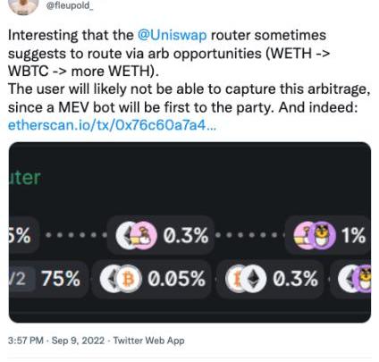 XRP/HKD-1.65%MEV距離最初的概念被提出不久,已然成為2022年的一個核心話題,MEV也被視為區塊鏈中的無許可激勵措施,用戶可在先到先得的基礎上提取。然而,黑暗森林中誘人的財富機會也很難發現,而是需要專門的能力。這些現象也引起了人們對以太坊生態系統中公共問題的擔憂,從優先gas拍賣引起的區塊擁塞問題到驗證者和區塊構建者之間可能存在的更嚴重的漏洞安全問題。在MEV的提取過程中,AMM就算不是最重要的組件也是最相關的組件之一,由于內存池的透明性,AMM的用戶不可避免地會連接到MEV機器人。這條推文直接反映了用戶可能面臨的麻煩。