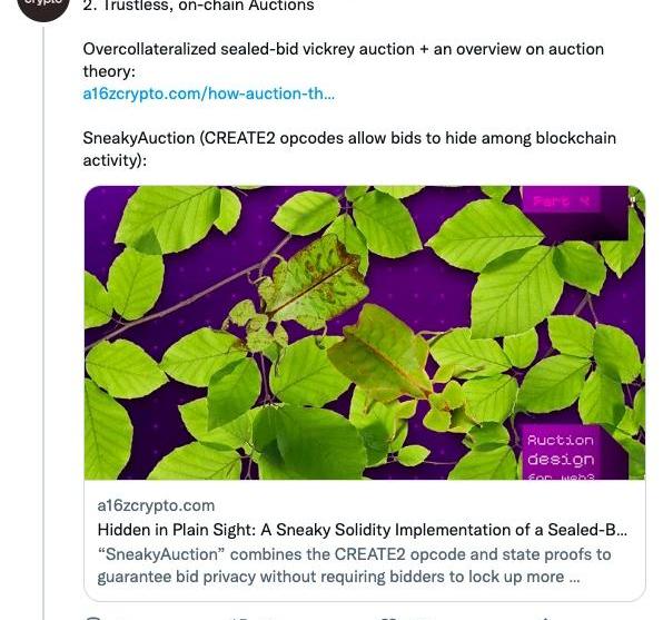 詳細信息:https://a16zcrypto.com/building-helios-ethereum-light-client/Github傳送門:https://github.com/a16z/helios二、無需信任的鏈上拍賣這是“維克瑞拍賣”的鏈上實現。所謂“維克瑞拍賣”,是指所有競拍者通過密封投標的方式競價,出價最高的競拍者獲得拍品,并支付第二高的報價。這套工具的基礎原理是,以太坊的CREATE2操作碼允許將競價內容隱藏在區塊鏈活動中。