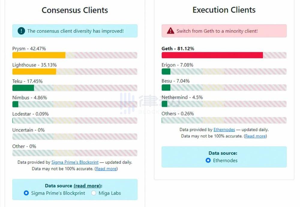 客戶端多樣性是建立彈性網絡的重要組成部分。通過讓節點使用的客戶端多樣化,它可以限制錯誤或攻擊對單個客戶端的影響并保護網絡。如果超過66%的驗證者使用單個客戶端,并且該客戶端受到攻擊或遇到嚴重錯誤,將會對整個以太坊網絡構成風險,并可能導致區塊鏈中斷以及節點運營商的巨額損失。要在網絡上達到最終確定性,則需要66.6%的驗證者。如果客戶擁有超過66.6%的市場份額并且他們分叉到自己的鏈上,他們便能夠完成。一旦發生分叉并最終確定,驗證者將無法返回原始鏈,并不會受到懲罰;如果66.6%的鏈同時被slash,則slashing懲罰為32枚ETH。那有什么解決方案呢?這些情況可以通過將客戶市場份額限制在33%,并教育社區了解客戶多樣性的重要性和鼓勵他們使用不太受歡迎的客戶端,以追求保持以太坊網絡的完整性和彈性來避免以上情況。當前共識和執行客戶端的分布如下: