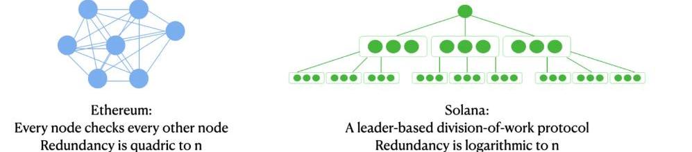圖源:CatcherVC交易的驗證層面:Solana出塊負責人將區塊分割,其他驗證者只需檢驗分到自己的部分,而不是整個區塊。Solana的出塊機制下,計算的冗余程度從n2下降至logn,從而實現了更高效的運轉。我們不妨來回憶一些經典數學題:如果n個人中,任意2人都需要互換賬本,一共出現了多少次賬本互換呢?答案是n(n-1)次,或者說n2級別。相應的,假設n個人中,任意一人都需要和一個已知的“領導”互換賬本,賬本一共被交換了多少次呢?答案是2(n-1)次,或者說n級別。再次假設,如果n個人中,已知的“領導”和每個人互換賬本的一部分,那么賬本總計被交換了多少次呢?顯然比n級別還要低,我們可以簡單理解為logn級別。其中對應以太坊,對應Solana。我們可以得到如下圖示,Solana的共識機制下,系統出塊所需的冗余計算大大減少,出塊速度也明顯提升。