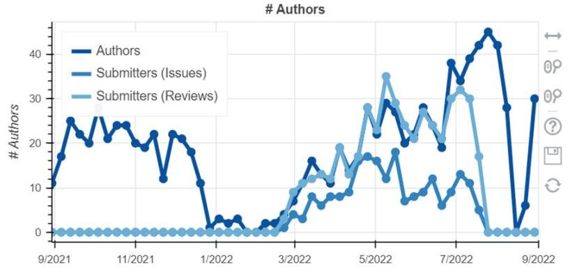 圖2-2Aptos代碼貢獻者情況Aptos的源代碼在Github上開源,項目代碼更新處于活躍期。從上圖可以看出,Aptos代碼在持續更新,過去一年以來提交的次數達到1.4萬多次,2022年7月份代碼提交次數達到高峰。開發者人數自2022年3月以來逐步增加,最高達到40人以上。這與團隊擴張的步伐、測試網推出的時間等基本匹配。2.4技術
