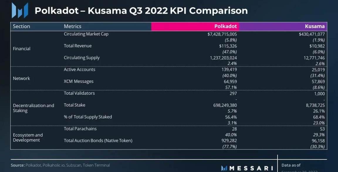 與經歷了Terra崩盤、ThreeArrowsCapital破產、俄烏戰爭升級以及美聯儲激進加息的第二季度相比,第三季度相對平淡。由于美聯儲維持鷹派政策,大盤在經歷了36%的反彈回吐了所有漲幅。波卡的估值表現在第三季度相對突出但關鍵績效指標和網絡基本面的數據喜憂參半。波卡的金融和網絡活動在很大程度上反映了原生中繼鏈活動。活躍賬戶、新賬戶、收入和代幣轉賬等密切相關的KPI均出現兩位數的百分比下降,可能是由平行鏈插槽拍賣參與度下降和熊市的預期推動的。波卡生態中的大多數活動都發生在平行鏈上。每個Layer1平行鏈都有自己的社區、經濟和治理模型,因此很難聚合數據。波卡社區的成員目前正在通過改進數據源以監控整體活動。在此期間,XCM消息充當整個生態系統活動的代理。自5月推出以來,已針對不同用例通過各種渠道發送了超過10萬條XCM消息。XCMV3的即將推出、更多HRMP通道的開放以及新平行鏈的加入應該會加速XCM的采用。波卡的去中心化和質押數據基本保持一致。驗證者總數、提名者總數和質押量占比等基本指標持平或略有上升,表明基礎層的生態系統正在健康運轉。波卡在本季度發布了兩個新的質押相關產品,提名池和質押儀表板,現在任何人都可以參與波卡質押并極大地改善質押用戶體驗。在接下來的幾個月中,波卡將發布一系列新產品,以進一步使得網絡更去中心化并改善其功能。即將發布的產品將包括GovernanceV2、XCMV3、新的公益平行鏈、異步支持和平行線程。為了在競爭日益激烈的市場中進一步推動使用率,發展中的波卡需要產生強大的跨鏈應用,以激活社區并吸引新用戶加入該平臺。原地址