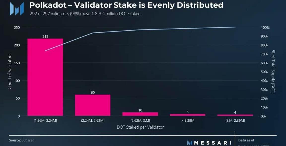 波卡的驗證者激勵方案可以使得所有驗證者獲得幾乎相同的獎勵。該激勵方案允許提名者在質押量較低的驗證者處進行質押來提高收益。在第三季度,總計297名驗證者中有292名處質押了1.8-340萬枚DOT。相對均勻的驗證者質押量分配提高了波卡的去中心化。雖然難以計算,但波卡可能具有非常有競爭力的NakamotoCoefficient。最終,波卡計劃將驗證者數量擴展到1000個,以支持100條平行鏈。但是,波卡必須首先改善網絡存儲和可擴展性,以支持額外的驗證者。