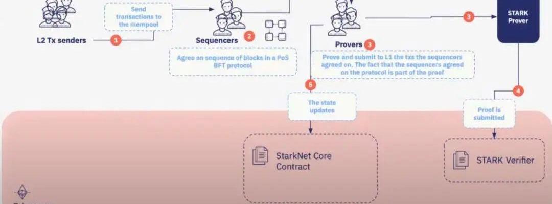 這兩種產品分別對應了兩種不同的商業模式,前者為應用提供定制化服務并出售,而后者則提供無許可的通用服務然后收取網絡上的交易費或者作為節點在交易費用優先的原則下抽取MEV。StarkWare聯合創始人EliSabasson曾做過一個比喻,將StarkEx和StarkNet的分別比作為計算機和云,購買StarkEx就像擁有自己的定制化計算機,每個客戶都擁有自己的擴容計算機。而StarkNet提供的是網絡,是通用服務,所有人都可以支付費用并使用。StarkNet的工作過程如下圖所示。它與StarkEx的最大區別是在StarkNet中由Sequencer取代了StarkExService來承擔驗證交易有效性、打包交易、調用Cairo程序執行的工作,而SHARP所承擔的生成證明的工作,在StarkNet中由Prover負責。目前,Sequencer和Prover都由StarkWare官方團隊來指定,這就帶來了中心化的質疑。