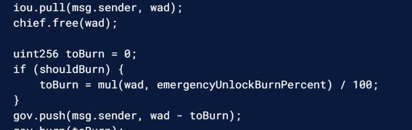 其次,也可能存在代幣持有者單方面繞過鎖定期的緊急情況,例如代理以高度不負責任或敵對的方式行事,當然這種情況不會經常發生。一種好的解決方案是允許代幣持有者通過不可撤銷地銷毀代幣來繞過鎖定期,這就很容易實現。初始化合約時,代幣所有者設置了一個EmergencyUnlockBurnPercent值。然后修改free函數來檢查token持有者是否選擇了緊急路由。如果是這樣,它只會歸還未燃燒的代幣份額并燃燒剩余的份額。我們在這里展示了該邏輯的一部分: