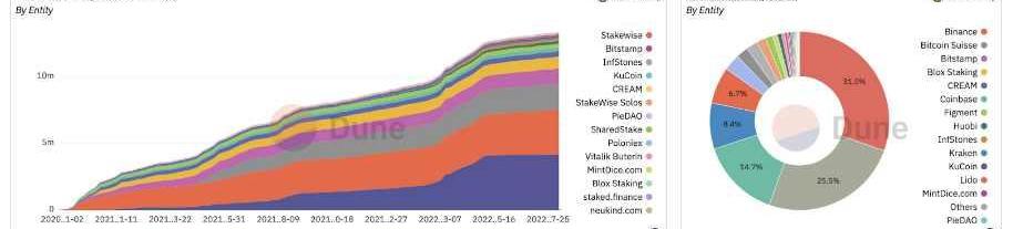 自合并以來,前兩名質押服務商合計持有43.03%的份額,前三名持有51.63%的份額。這里的風險在于,如果Lido和Coinbase聯合起來,可以使網絡停止運行;如果Kraken也加入,那么三者將可以接管以太坊網絡。