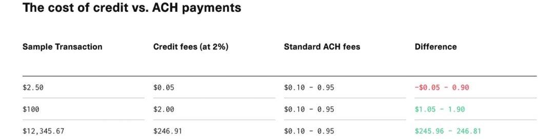 ACH的好處非常明顯——極低的處理費用,比卡網絡低一個數量級: