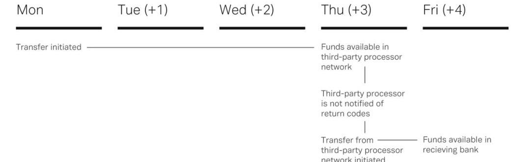但是ACH在背后的做法是把銀行的交易打包起來,一天分四次發給對手銀行,受限于整套機制設計、成本和處理能力,通常需要3-5天完成實際結算: