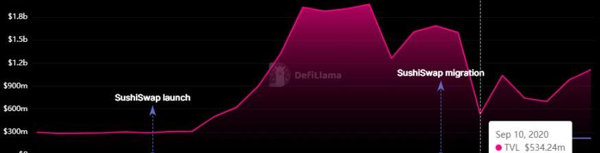 資料來源:YamFinance作為一項貨幣實驗,YamFinance從一開始就探索了各種DeFi概念,例如彈性供應代幣、協議金庫治理、公平的代幣分配機制和完全鏈上治理。該協議的治理代幣以紅薯命名,均勻分布在八個質押池中,以覆蓋整個DeFi社區。在不到48小時內,這個收益耕種協議憑借其高利潤的收益獲得了超過6億美元的TVL,隨后引發了DeFi食物代幣耕種的狂熱。一個接一個,憑空出現,你會看到「美味」的名字,比如PickleFinance、CreamFinance、Beefy.Finance、Kimchi、BurgerSwap、Tendies等等。人們會認為這是牛市高峰期興奮的跡象,但degen終歸還是degen,無論如何他們都只是在模仿。不幸的是,在YAM的代幣中發現了一個嚴重的錯誤,導致代幣超發并最終導致代幣價格下跌,造成超過5億美元的財富損失。同樣,YamFinance的許多其他效仿和分叉項目也遭受了類似的命運。SushiSwap:Uniswap衍生產品