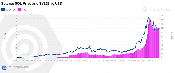 盡管就 TVL 而言,以太坊仍然是領先的區塊鏈,但 Solana、Terra 和 Avalanche 三個公鏈取得的進展堪稱典范。Solana 與其他幾個網絡一樣,直接受益于以太坊交易成本過高的缺點,Solana 的 TVL 已達到 82.8 億美元,比上一季度增長了 1,300%。僅考慮 TVL 來說,Solana 是目前第三大 DeFi 公鏈。