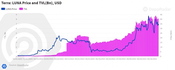 Terra 已成為 TVL 方面的第四大 DeFi 公鏈。它擁有行業內交易量最大的穩定幣之一,即 Terra USD (UST)。目前,Terra 的 TVL 為 80.9 億美元,環比增長 137%。Terra 的 DeFi 生態系統擁有四個 TVL 超過 10 億美元的 Dapp。例如,收益優化器 Anchor 的 TVL 已超過 30 億美元,而 Terra 的 Lido 則為 25 億美元。對于 Terra 網絡中 DeFi 的潛力,我們可以繼續保持樂觀。?