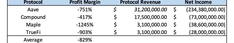 來源:TokenTerminal此外,相對于其他DeFi協議,貸款人的利潤率非常低,因為他們不得不積極釋放代幣,以吸引流動性并獲得市場份額,貸款市場的平均TTM利潤率為-829%。定價能力:中/強