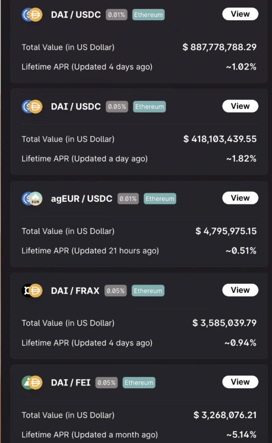 Arrakis目前TVL占到UniswapV3TVL(Ethereum)的24.5%,是UniV3目前最大的LP。值得注意的是,UniswapV3中TVL最大的兩個pool:DAI/USDC(0.01%),DAI/USDC(0.05%),也是Arrakis最大的兩個pool,這兩個池子Arrakis分別占比99.5%,98.6%,意味著UniV3上DAI的流動性基本上就是由Arrakis提供的,Arrakis實際管理著UniV3上TVL最大的兩個pool,DAI的做市商正在完全使用Arrakis進行流動性管理。