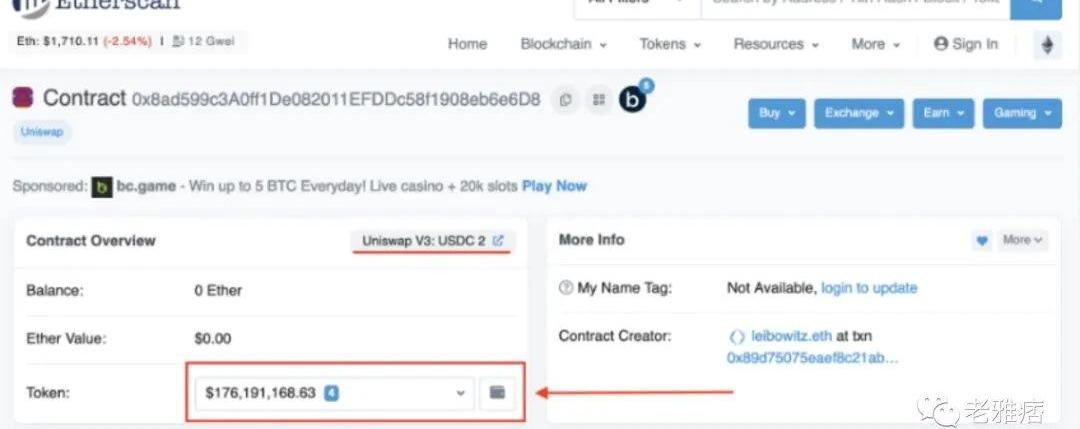 看看Uniswapv3上的3號池——它有3.33億美元的TVL和6100萬美元的日交易量。我馬上遇到了一個問題:我計算的TVL價值是1.76億美元,而不是Uniswap網站上報告的3.33億美元。好吧,bug發生了。但在開始調試之前,我決定在最流行的以太坊區塊鏈瀏覽器Etherscan上驗證TVL。嚴格來講,每個Uniswapv3池都是一個智能合約。因此,區塊鏈瀏覽器可以顯示池里擁有的代幣余額,也就是TVL。