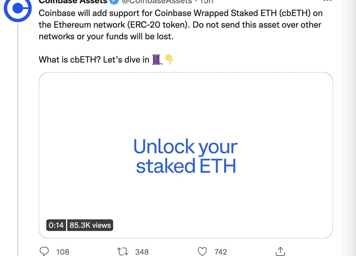 Coinbase在以太坊合并之前上線流動質押代幣cbETH,用戶可以通過cbETH出售、轉移、消費或以其他方式使用鎖定的質押ETH其它:ETC利好、礦工遷移