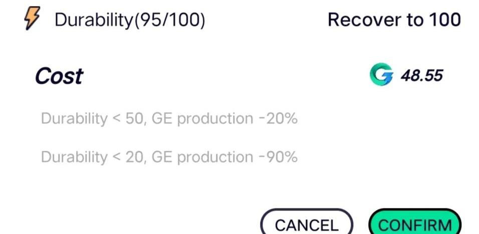 耐久度影響產出的效率。寶寶在每次完成充電后都會減少耐久度,當耐久度低于50時,GE產量降至80%,當耐久度低于20時,GE產量降至10%。每次修復耐久需要消耗GE,消耗量則根據等級和毅力值而不同。