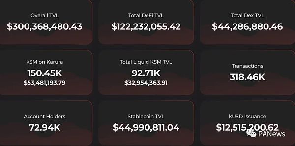 對于Karura生態發展的情況,可從其網絡整體數據表現窺探一二。截至10月18日,Karura全網鎖倉總價值(TVL)已超過3億美元。其中,DeFi的總鎖倉價值超1.2億美元;DEX在僅支持3種原生資產的情況下總鎖倉價值已超4428萬美元;穩定幣的總鎖倉價值達4490萬美元。同時,Karura的賬戶總數近7.3萬,kUSD的發行量超1251萬枚。此外,大約有15萬枚KSM跨鏈至Karura網絡,價值超5348萬美元。