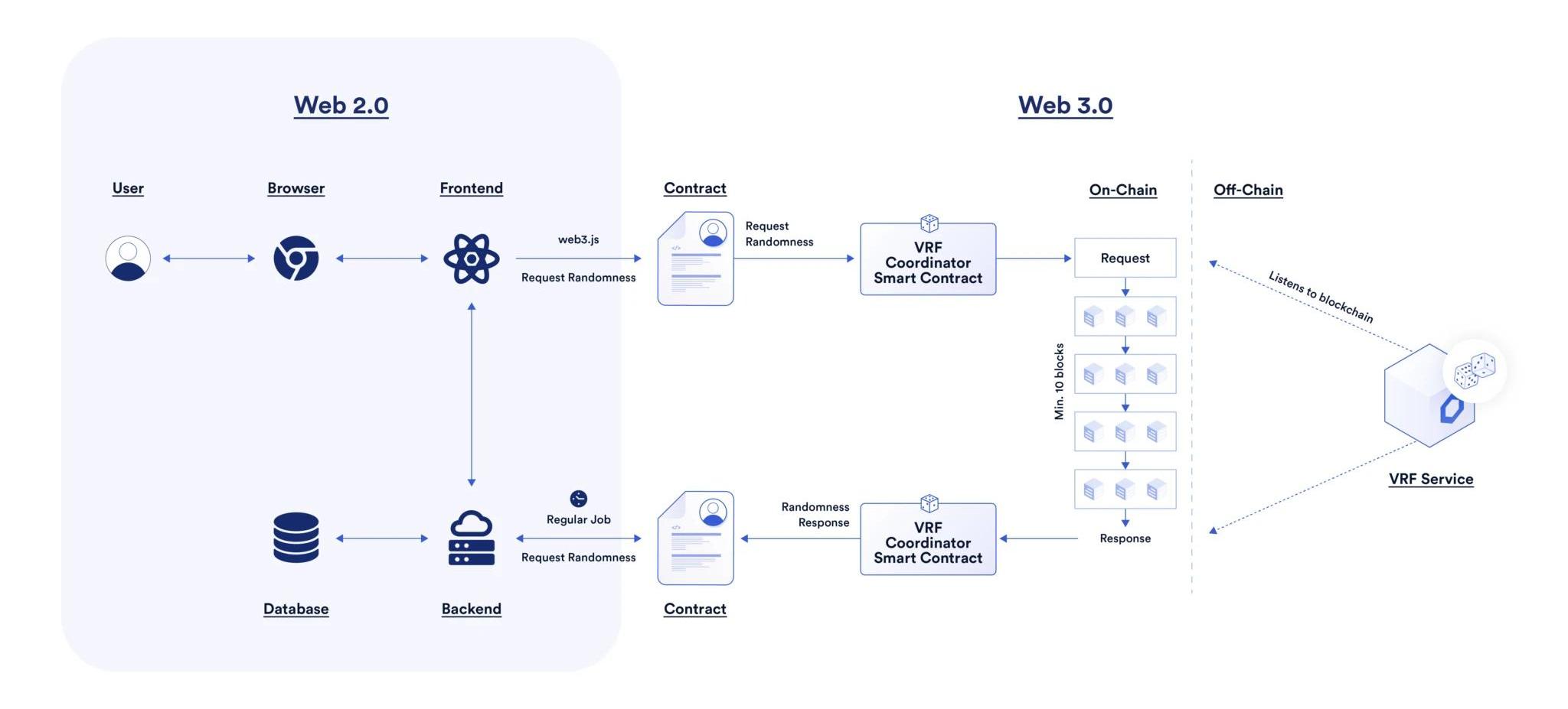 Web3是互聯網的下一個發展階段,采用了區塊鏈技術、智能合約和去中心化預言機網絡來提供更安全可靠的web服務。Web2應用的優勢在于無需從零開始打造新產品和基礎架構就可以享受Web3的諸多好處。Web2可以將ChainlinkVRF等信任最小化的Web3服務原生集成至自己的應用中。ChainlinkVRF:通過加密技術保障安全且可驗證的RNG方案