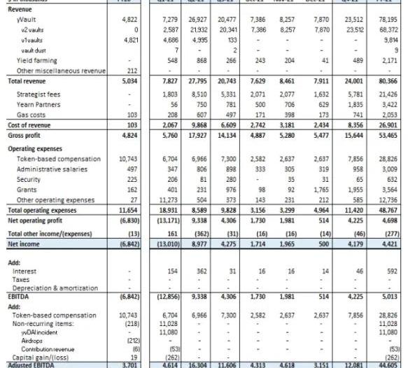 查看DAO的財務報告是確定DAO財務狀況的好方法。以Yearn的季度報告中顯示的收入、支出和營業利潤率為例: