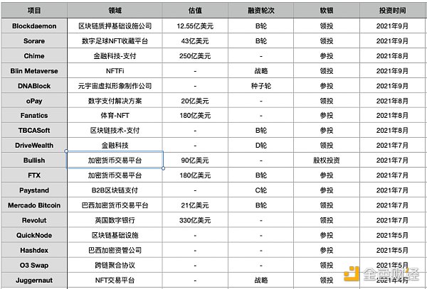 金色財經整理發現,軟銀在2021年加密貨幣領域的投資著重于三方面:NFT、加密支付、加密貨幣交易所。