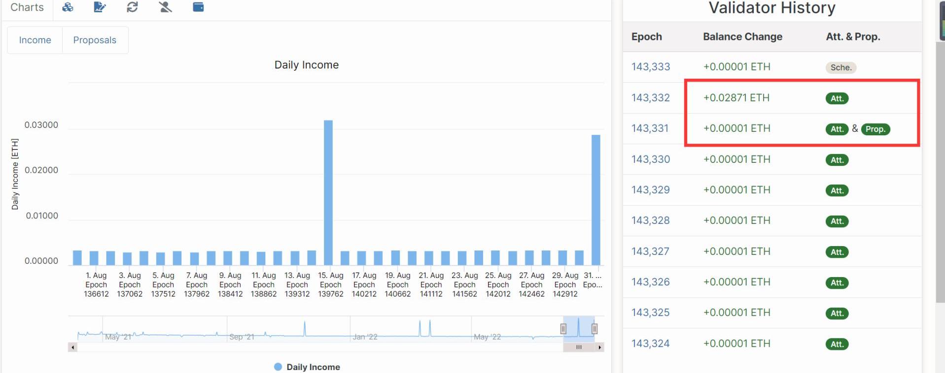 Attestation獎勵:每一個slot的committee都要對前一個Epoch歷史區塊檢查點進行Attestation,成功Attestation以后會獲得Attestation獎勵,作為Validator的收入之一。