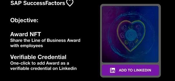 2022年初,SAPSuccessFactors榮獲SAP首個年度業務線獎。SAP的全球負責人NicolleSternberger正在尋找一種方法來獎勵SAPSuccessFactors部門團隊的每位成員。最終,Sternberger決定與NFT.KRED合作創建NFT以通過可驗證的證據來紀念這一成就,旨在展示其團隊的協作和創新精神。他們將員工引導至NFT.KRED的網站。然后要求員工使用他們的工作電子郵件地址進行注冊,然后單擊“ClaimAwardNFT”。一旦團隊成員獲得了NFT,就可以將它集成在LinkedIn上,成為他們獲得的榮譽。
