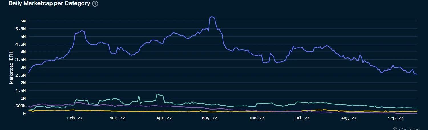當前鏈上轉賬費用約為$1.94,Uniswap交易費用約為$6.6,Opensea的交易費用約為$2.56,本周出現了多次單日Gas激增現象,可等待合并后Gas表現情況是否產生重大變化。NFT市場數據變化