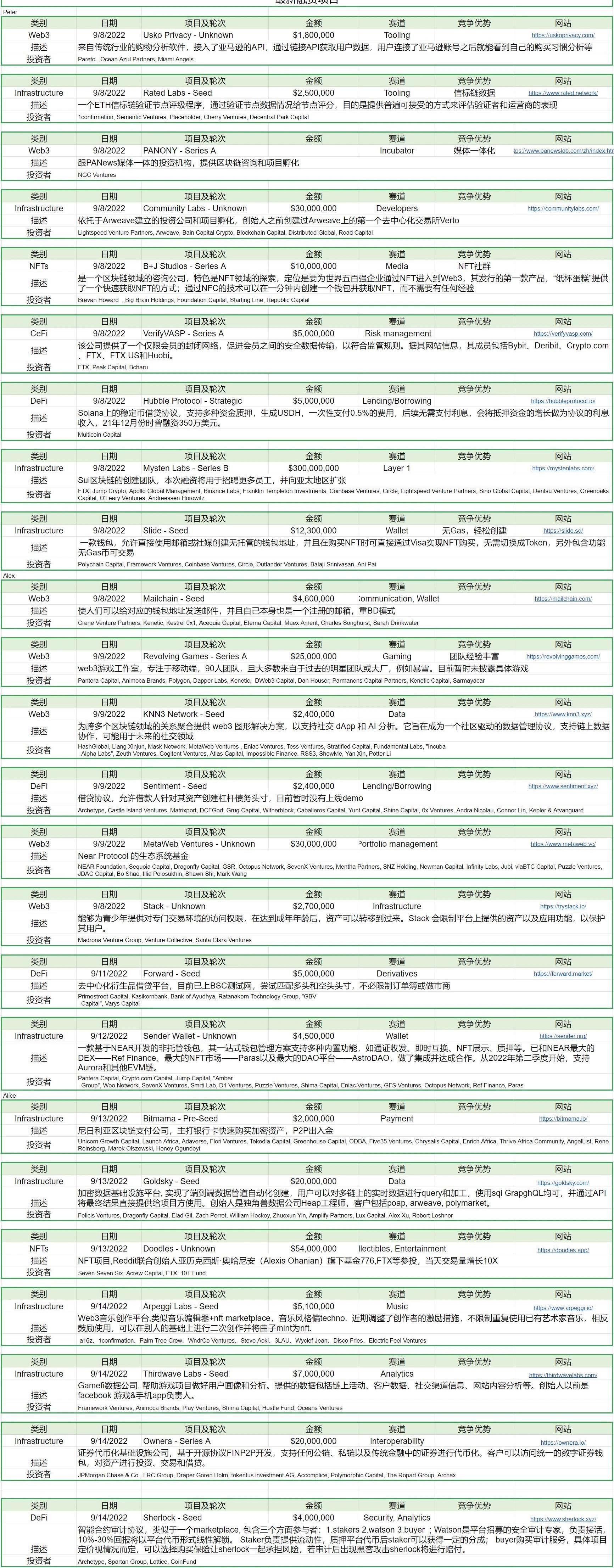 NFT市場總值現已跌破前低,在此市場環境下Social類型NFT占比達到82%,而Game類型NFT占比已下降至1.19%,整個鏈游市場全部NFT總價值已低于5000WU,真實有交易價值和流動性的只會更低,基本說明當前鏈游市場已接近死亡,在下一周期中需要更多關注新鏈游項目;當前市場上熱點著重關注在ETH合并事件,NFT領域短期未出現新的熱點,交易排名靠前仍以老牌藍籌為主,但對比一個月前,整體交易量下滑嚴重,流動性不足問題越發嚴重。上周提到的項目RTFKTCloneXForgingSZN1,可能因其背后有CloneX的原因,仍具備較高的活躍度,短期可繼續關注。項目最新融資情況