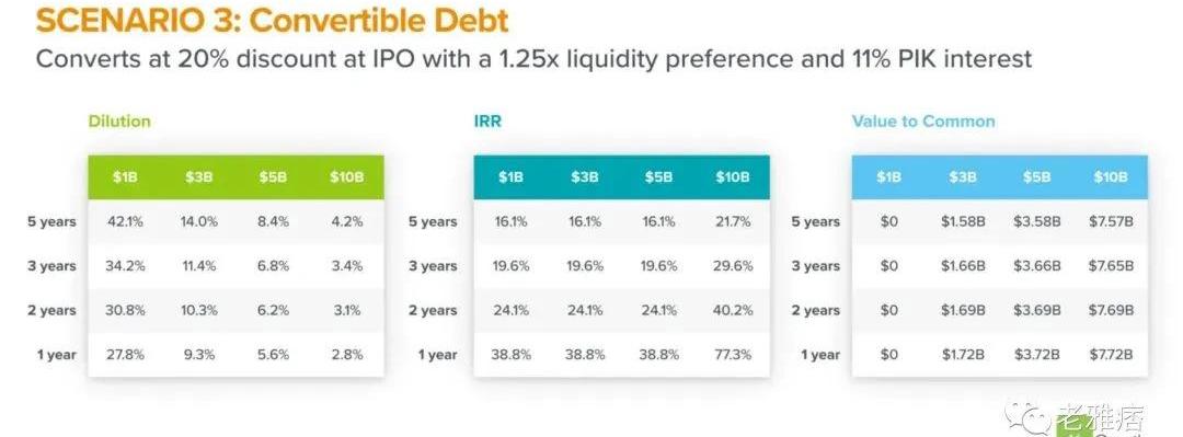 對于我們的第三個場景,該公司將獲得2億美元的可轉換債券,轉換價格為IPO價格的20%折扣,11%的PIK利息,以及1.25倍的優先流動性偏好。新投資者的所有權取決于IPO價格和時機。舉個例子,如果公司的估值在兩年內比上一輪翻一番,在IPO時達到100億美元,那么可轉債將轉換為公司股份的2.4%。另一方面,如果公司IPO價格為50億美元(與之前估值持平),可轉債將轉換為約4.8%的公司股份。如果該公司IPO價格為40億美元(比先前估值低20%),可轉債將轉換為公司股份的約6.0%。