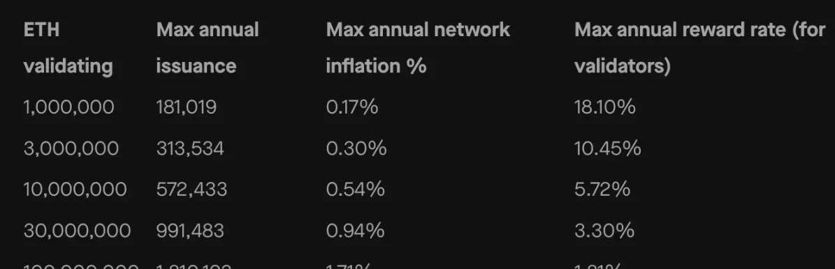 隨著越來越多的ETH被質押,不僅獎勵率會降低,而且年度通貨膨脹率也會增加,從而導致實際收益率更低。在極端情況下,如果質押100~120M,所得獎勵率減去通貨膨脹率將是1.81%-1.71%=0.1%APY。在某些方面,這對以太坊本身有好處,更多的ETH質押等于更高的安全性,想要攻擊網絡則需要更多的成本。而只有當供應量的一小部分被質押時,真實質押獎勵才會很高。整體獎勵是一種通脹形式,以犧牲尚未質押的人的利益為代價來反哺質押者。這是對他們懶惰、規避風險、不成熟的懲罰。