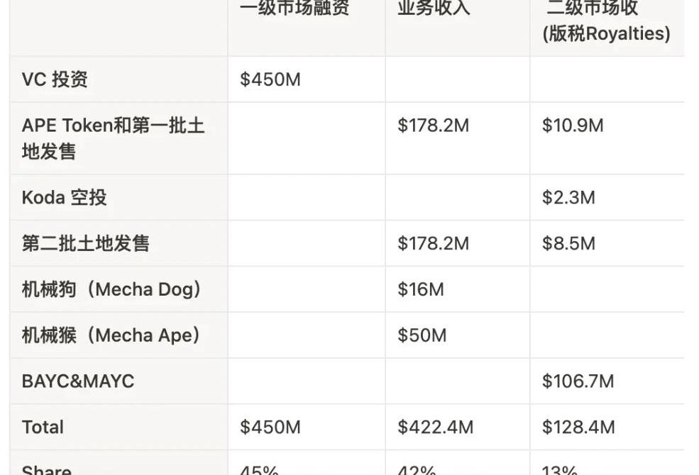 同時我們看看PFP類NFT目前Top1項目方YugaLabs是如何獲得營收的。其預測2022年有5.5億美元收入,加上VC融資的4.5億美元總共10億。可以看到,一級市場融資占到45%,業務收入占到了42%,版稅收入只有13%,而且大頭還是靠2021年發行的BAYC和MAYC