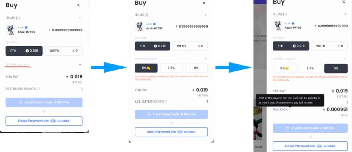 首先我們詳細看下x2y2這次增加的功能,由買家來選擇版稅分配的比例從UI設計上,這個功能使用的是更小號的灰色字體,而且默認是折疊起來的;同時名字叫”OPTIONALROYALTY”,說明目前定位是一個二級甚至三級功能,先測試主動發現這個功能用戶的反饋。按照點擊轉化率的常識,二級功能的使用率在10%左右。用戶點擊”OPTIONALROYALTY”后,默認選中的是版稅100%給項目方,同時下面有一句紅色的文案強調”Doconsiderpayingroyalties,sothatthecreatorscanbuildmoreforthecommunity.”(一定要考慮支付版稅,這樣創作者就可以為社區創造更多內容),告知用戶版稅的重要性,也就是說這里的選擇要謹慎用戶有3個版稅選項,100%/50%/0%.如果選擇100%,版稅還是全部給項目方;選擇50%,版稅一半給項目方一半返給用戶;選擇0%,版稅全部返給用戶稍微展開一下,為什么是讓買家購買時選擇,而不是賣家上架時選擇版稅比例呢?下面是我自己的思考買家是為項目真正買單的一方,由出資人選擇更為公平,這個項目這筆交易是否值得支付版稅softrug的項目方以及用戶割肉的時候,一定要支付版稅嗎?如果是賣家來選擇,會讓事情變得復雜,除非像sudoswap一樣一刀切。具體講會有2個問題上架過程變得復雜,賣家需要根據收益,計算不同版稅下設定的價格。另外如果賣家想同時上架2個版本呢,一個有版稅一個沒版稅,這就更復雜了買家的選擇過程變得復雜。不排除有的買家就是要選擇有版稅的NFT,又增加了一道篩選過程,降低用戶體驗和交易成功率總結一下,x2y2用了一個二級功能給了用戶選擇版稅的權利,一開始先測試10%左右用戶的反饋,同時也建立了調整版稅的能力,相比賣家選擇用戶體驗更好。這也和上次AMA里面CEOTP講到版稅時說「會看事態發展」的態度匹配。p.s.很多聲音都說這里用戶一定會選擇0版稅,這的確是考驗人性的地方,我自己其實覺得未必。從社會文化來看,西方社會本身有「小費」共識;我自己作為用戶,好的項目方,特別是好的藝術家,我是愿意付版稅的,很好奇具體的數據會是什么樣,x2y2是否可以作為一次社會實驗,做個分享和探討:)