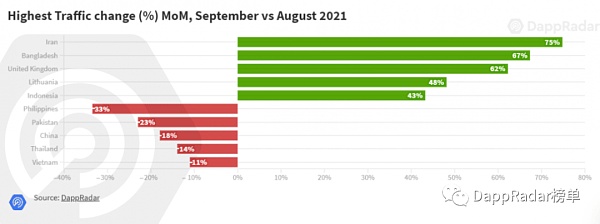 與上月相比,流量增長最顯著的其他國家是伊朗。這個中東國家最近參與了有關加密貨幣挖礦的政府討論。相比之下,東南亞國家的流量一直在減少。例如,來自菲律賓的流量月環比下降33%,而泰國和越南的流量比8月份分別低14%和11%。