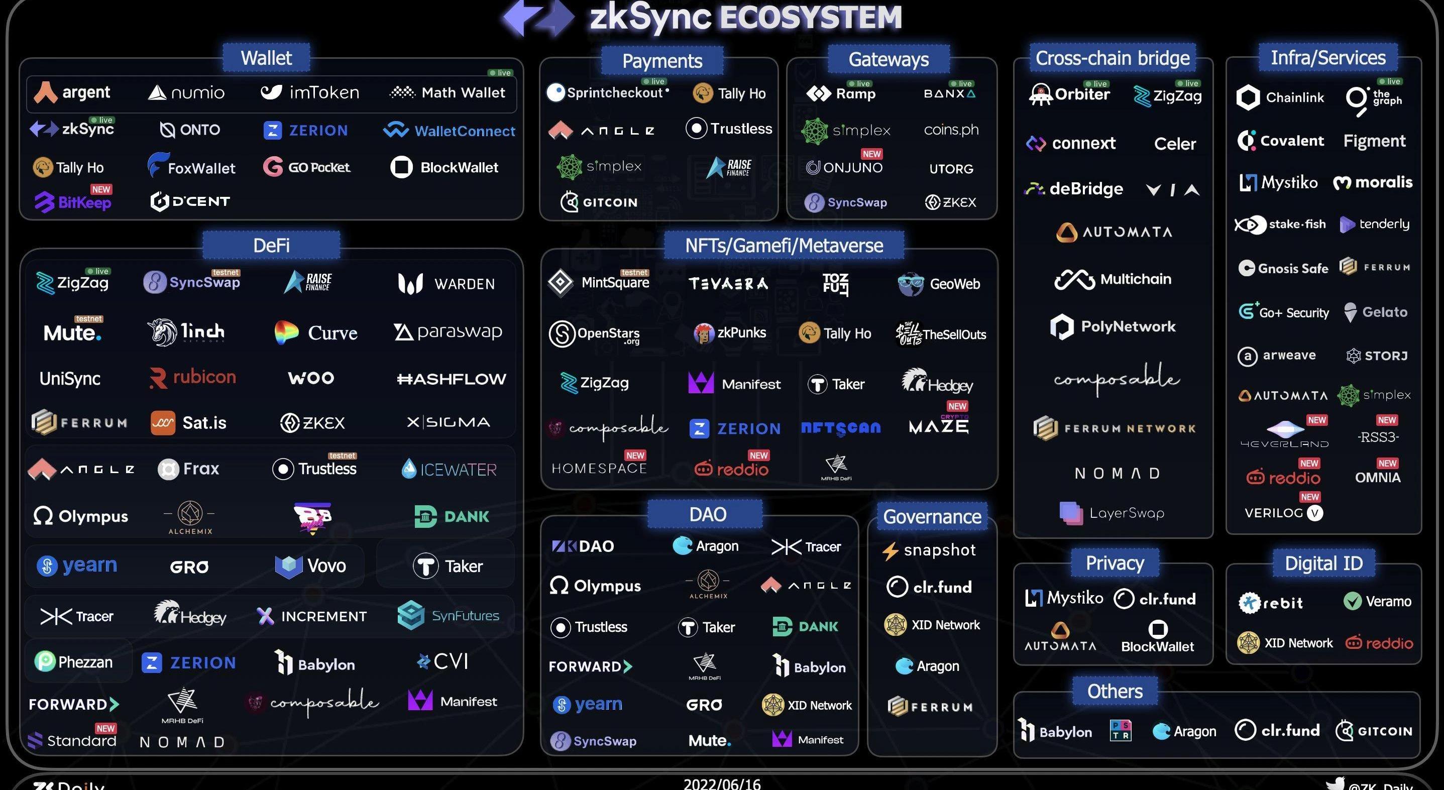 關于PolygonHermez的EVM實現,YeZhang在推特上表示,“Polygon使用一組新的匯編代碼來表達每個操作碼,即人類可讀的字節碼翻譯,這可以讓代碼在EVM上的行為有所不同,可以實現“字節碼級別”的兼容性,但行為可能與EVM不同,PolygonHermez的方案更簡單且可能更高效,也有可能出現一些未知的情況。”目前代碼已經開源。官方稱其實現了EVM等效性,在開放測試網后,開發人員可以將任何以太坊智能合約無縫部署到PolygonHermez。計劃就在下半年推出公共測試網。zkSync:行業老兵