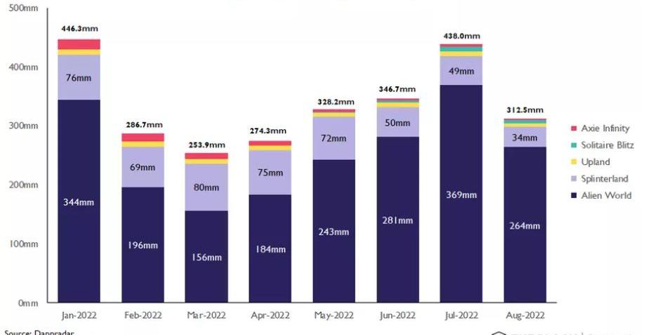 整個游戲市場大約有1575個項目,有40%左右集中在BSC上,26%在以太坊,15%在Polygon。而像ImmutableX、GalaGames、WAX、Enjin和WemixNetwork等游戲專用鏈僅1%到6%的市場份額。