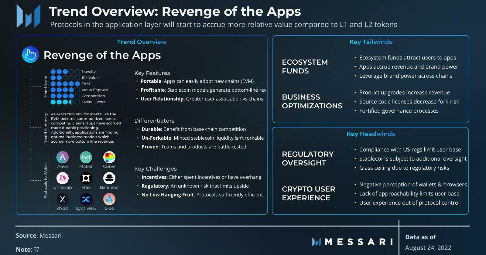1、核心特點便攜性:APP現在可以輕松適應新的區塊鏈;可盈利性:利用穩定幣模式,應用協議可以產生“底線收入”;用戶關系:相比于傳統網絡協議,應用協議可以產生更好的用戶關聯。2、關鍵差異可持續性:應用協議將從基礎鏈競爭中收益;不可分叉:鑄造的穩定幣流動性不會面臨分叉風險;可驗證性:產品和團隊經得住實戰考驗。3、主要挑戰激勵:需要提供ETH激勵,或是提供超額激勵措施;監管:需要面臨監管不確定性風險;有利因素