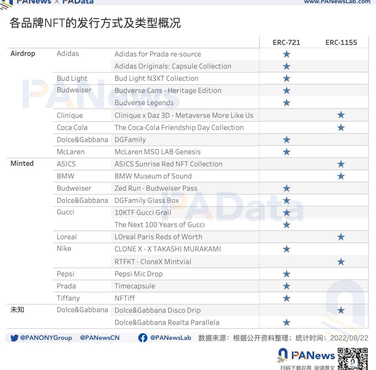 XRP/HKD-1.72%從去年開始,隨著NFT的大火,各大品牌入局NFT的消息也不絕于耳。比如Tiffany面向CryptoPunk持有者推出NFTiffsNFT;耐克旗下加密時尚品牌RTFKT發行了CloneXNFT;Burberry在社交游戲平臺Roblox上推出了手袋NFT允許用戶購買并裝扮數字化身;百威啤酒Legends系列NFT授予持有者一系列線下福利,包括與猶他爵士隊和韋德進行會面、參加慈善活動、獲得韋德虛擬球衣等。除此之外,不少還沒有發行NFT的品牌也在蠢蠢欲動,比如星巴克在財報會議上宣布即將推出以咖啡為主題的NFT;瑪氏為旗下品牌士力架、德芙和M&Ms提交NFT相關商標申請;賓利宣布即將發布限量版NFT等。可以說,NFT如今已經成為連接傳統品牌與加密圈的最佳橋梁,品牌為NFT提供了新的價值,而NFT則為品牌注入了新的活力。那么,這些品牌NFT能否實現品牌、用戶、加密市場的三方共贏?品牌NFT的吸金能力和投資潛力有多大?PANews旗下數據專欄PAData根據公開資料統計了15個品牌共23個NFT項目的基本信息和市場數據,分析發現:1)23個項目中有16個項目采用了ERC-721協議,占比約為70%。但品牌NFT的形式與所屬代幣協議并沒有絕對的關系,一些品牌/產品收藏品也采用了ERC-1155協議。2)23個品牌NFT項目共計發行了96002個NFT。與原生NFT項目動輒發行1萬個相比,品牌NFT的單項發行數量普遍是偏少的。3)23個品牌NFT項目歷史累計持有地址總數達到了57307。與市場中熱門的原生NFT項目相比,品牌NFT的歷史持有地址數量并不少。這或許說明品牌NFT并沒有為NFT市場帶來新的圈外用戶,其規模并沒有顯著高于市場上的原生NFT項目,不過若與一般的原生NFT項目相比,這些品牌NFT更容易受圈內用戶歡迎。4)截至8月22日,Nike發行的NFT在二級市場上的累計總交易量最高,達到了26.27萬ETH。此外Dolce&Gabbana和Gucci的交易量也較高,分別達到了4597ETH和4407ETH。但這些品牌的交易量高度依賴單個項目。5)20個項目的NFT最近30天二級市場上的成交均價的中位數約為0.21ETH。總的來說,Nike的NFT在二級市場中的價格表現更優。并且,空投發行的NFT在二級市場上的成交均價最高不超過0.4ETH,大多都低于以鑄造形式發行的NFT,后者在二級市場上的成交均價最高能達10ETH以上。6)根據隨機抽樣,品牌NFT在5次以內的平均換手收益率約為22.35%,與PAData在去年9月統計的22.65%的平均換手收益率基本接近,也即,品牌NFT沒有表現出超越NFT一般市場水平的盈利能力。01