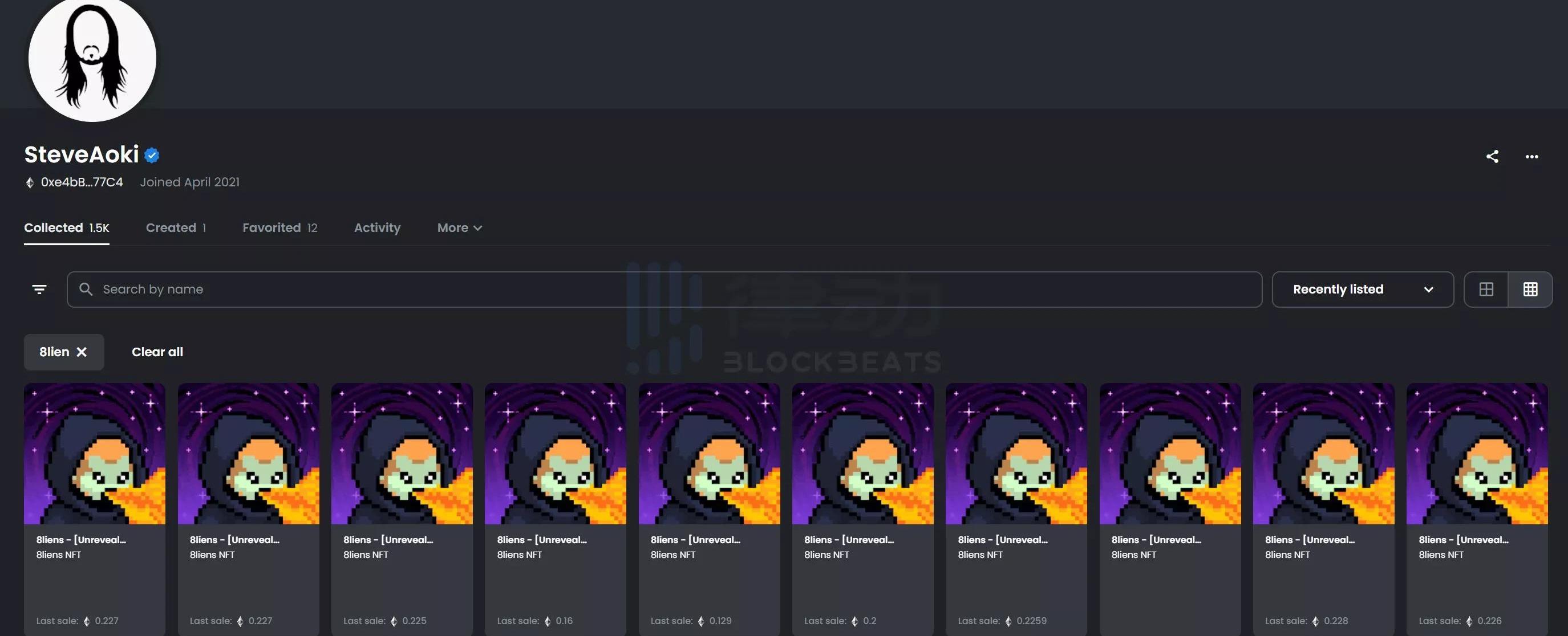 8liens藍籌率與部分藍籌持有者持倉情況不僅如此,目前持倉前三的大戶darren.eth、0x4c0dbe2bfa35c379788d0d5b1d7f2e749945509f與0x84e01061fa6b69c1629e3578d988eb20cb73a677更是連一個8liens都沒有擺上貨架,真的很「鉆手」。值得一提的是,SteveAoki也買入了10個8liens。