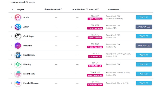 關于競拍的其他具體細節,目前還未公布,但已近有不少項目推出了前期的活動和預注冊獎勵,來吸引用戶參與,已經宣布參與Polkadot競拍的項目的主要有8家,分別是Acala(Karura)、Aatar(Shiden)、Centrifuge(Altair)、Darwinia(Darwinia?Crab)、Equilibrium(Genshiro)、Litentry、Moonbeam (Moonriver)和Parallel finance(Heiko)。(注:括號中為各項目先行網名稱)