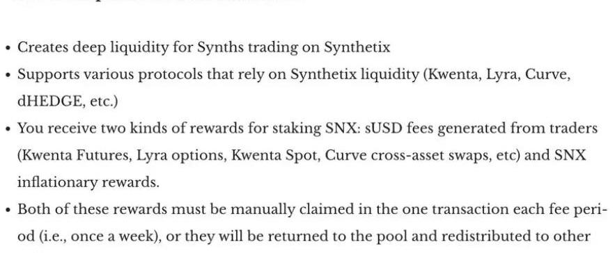 Avalanche上排名第一的DEX。將JOE質押到sJOE并獲得穩定幣獎勵-'USDC'。TraderJoe對每次交換收取0.05%的費用。這會被轉換為穩定幣,然后每24小時分發到sJOE池中。6.Synthetix(Ethereum/Optimism)