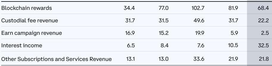 在第二季度,Coinbase的零售用戶交易量環比下降37.8%,為460億美元,貢獻收入下降至6.16億美元,機構用戶交易量環比下降27.2%,為1710億美元,貢獻的交易收入下降至3900萬美元。Coinbase還在股東公開信中進一步透露,平均每個零售用戶該季度貢獻的交易收入約為29美元,由此計算該季度累計交易用戶達2124萬名。此外,截至第二季度末,Coinbase的總驗證用戶數量首度突破1億并達到1.03億,同比上漲51%,不過第二季度平均每月活躍用戶為900萬名,較第一季度下降約20萬。平均每月活躍用戶是指每月至少交易一種或多種產品的零售用戶,包括代幣交易、質押產品等。Coinbase表示在第二季度中,月活用戶更傾向于質押等非投資類活動,其中,67%用戶參與的交易包括非投資類產品。反映在財報中,訂閱與服務收入成了為數不多的亮點,在第二季度取得1.47億美元的收入,同比上漲約44%,較第一季度也僅下跌2.6%,可見Coinbase在收入多元化方面取得一定進展,但對總業績的影響仍然比較微小。具體而言,區塊鏈獎勵收入為6800萬美元,同比上漲98%,但較第一季度下降16%;托管費用收入為2200萬美元,同比下降30%;Earn活動收入約250萬美元;同比下降97%;利息收入為3300萬美元,同比增長211%,主要原因是USDC相關活動以及更高的利率,為法幣客戶托管資金產生了利息;其他訂閱和服務收入收入為2179萬美元,同比上漲約66%,該部分主要是云服務部門CoinbaseCloud的收入。