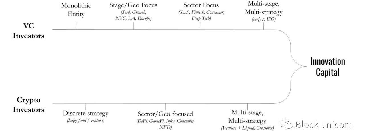 對基金策略如何隨時間變化、它們如何合并,非常簡單的看法當你回顧金融歷史時,很明顯,在牛市周期,機構開始聚集,并試圖將更多的競爭力納入自己的傘下。這發生在投資銀行,現在也發生在我們傳統上稱為風險投資的領域。在許多資產類別的早期階段,會出現對特定資產類別深信不疑的特定基金,而特定LP會推動這種資產類別差異化的敘事,因為LP通常會根據風險概況、資產類別或其他關注領域(如地理)將基金經理劃分為不同類別。這種情況在2016年發生在加密領域,當時我們看到許多加密對沖基金和風險基金的崛起,它們的初始融資策略通常非常分散(這段時間我們在Compound支持了多個此類基金,最著名的是MulticoinCapital、1Confirmation),并在2021年+再次發生,因為機構開始籌集單獨的資金,用于部署到加密資產管理公司。我們在2016年(或許還有2021年)看到的是,加密資產類別內部有一個明確的認識,即由于項目啟動方式的差異(一些人選擇不進行私募融資),存在重大的“跨界”機會,同時也因為在一個仍然利基的資產類別中存在有意義的阿爾法,讓早期的管理者通過多策略方法進攻加密貨幣,從而成為“機構”。與此相呼應的是,傳統的風險投資正在經歷自己的階段特定基金周期,目的是通過擴展到多階段公司來積累更多的資本和獲得更多的alpha/beta。在此期間,隨著跨界基金的崛起,這種情況有所進展,它們從公開市場深入到私人市場。隨著DeFi和NFT的興起,類似的范式開始出現,產生了現在的多重DeFi和NFT基金。早在2021年2月,我就公開征求個人(通過syndicate)投資NFT基金經理的申請,最終成為一家更大的機構NFT基金的LP。在需求旺盛、資本充裕的牛市周期中,所有這些進展都是很自然的。我相信,這種發展將從根本上改變更廣泛的風險資本和非流動性資產類別市場。從私人市場投資轉向純粹的創新投資,NFT是一個信號,預示著未來將以多種方式出現。