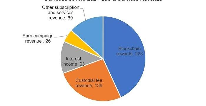 Coinbase的收入流來源“偏科”較為嚴重,想用其他收入取代其核心零售交易業務收入幾乎不可能。2021年,Coinbase7%的收入來自于所謂的“訂閱和服務收入”,分為五個獨立的部分:區塊鏈獎勵收入、托管費收入、利息收入、傭金賺取活動收入和其他收入,如下圖所示: