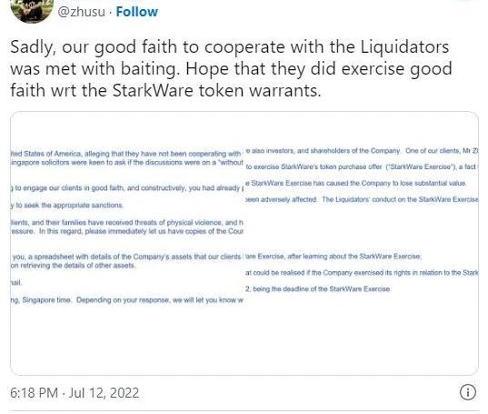事情的由頭要說回7月8日。上周五,三箭清算人向美國紐約提交的法庭文件,指控三箭方面不配合清算程序,原話是“還沒有開始以任何有意義的方式配合訴訟程序”,并表示,在最初的Zoom通話中,自稱SuZhu和Kyle的人在場,但他們的視頻和音頻被關閉,且未直接回應向他們提出的問題,而是由三箭的律師代為回答。此外,法庭文件顯示,拜訪過三箭集團新加坡辦事處的債權人律師發現該辦事處已被廢棄,并在法律文件中表示Suzhu已經“下落不明”。因此,三箭清算人申請于美國紐約當地時間周二上午舉行召開三箭資本債權人緊急聽證會,這一申請已被法院批準。債權人正尋求凍結三箭公司的資產。他們首先要求法院迫使三箭創始人公開基金全部資產。今日,針對這一控訴,Suzhu推特披露的其中一封郵件意在指責清算人的“誘導”行為。三箭的法律顧問在郵件中指出,最開始三箭清算人的新加坡律師曾“善意”地詢問并“建設性”地討論是否在“不妨礙”的基礎上進行清算程序和溝通,但事實上,對方已經準備好提出申請,“實際上是想以此引誘我們的客戶”。三箭的法律顧問還表示,之所以三箭的創始人SuZhu和Kyle在周五的Zoom會議中選擇“關閉”視頻和音頻,是因為包括Suzhu等三箭方面的工作人員及其家人在面臨人身暴力威脅,并且想集中精力準備新加坡金融管理局的一些詢問。基于此,三箭將“采取必要措施尋求適當的制裁”,并表示SuZhu和KyleDavies不會出席今晚9點在紐約舉辦的法庭聽證會。而為了回應“不配合”清算程序的質疑,該郵件還附上了三箭在“在短時間內能夠匯總的公司資產的詳細信息”,并表示,三箭公司會持續提供相關資產信息。此外,在Suzhu披露的另一封郵件內容控訴了清算人未兌現收購要約,導致Starkware代幣股權認證已于7月5日到期,這一失職行為導致公司產生了“重大損失”。并且這一控訴已經在7月8日的電話會議中得到了清算人法律顧問的證實。據悉,去年11月,三箭參與了StarkWare5000萬美元的C輪融資,而StarkWare目前并未公開發幣。在這封郵件中,三箭要求對方披露以下信息:1.清算人是什么時候知道StarkWare股權確認通知的;2.清算人在了解StarkWare行動后,采取了哪些與StarkWare有關的步驟;3.清算人采取了哪些步驟來確定StarkWare股權確認可實現的價值;4.清算人是否在2022年7月5日之前與StarkWare取得聯系,即StarkWare行動的截止日期。雖然看上去,Suzhu的反擊和回應,讓三箭“逃”過了今晚的聽證會。但三箭聯合創始人KyleDavies已被傳喚在7月19日通過視頻會議提供證詞并提交文件。積極的一點是,只要Suzhu還在發聲,就證明他還在嘗試解決問題,三箭事件還沒劃上句號,后續如何還請繼續關注。
